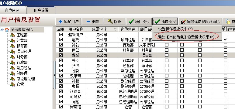回到用戶設置模塊,選中要授權的用戶后點擊【模塊授權】,選第二項【通過崗位角色設置模塊權限】來對操作用戶設置崗位權限。