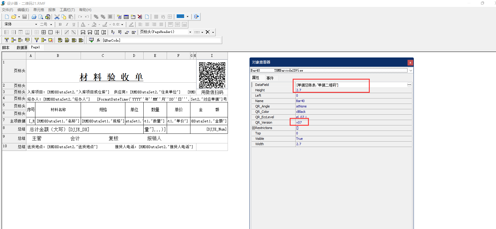3、設置好二維碼樣式之后右鍵點擊單元格,點擊屬性。設置字符來源(datafield)為“[單據總賬表."單據二維碼"]”,二維碼版本(QR_vesion)為:v07
