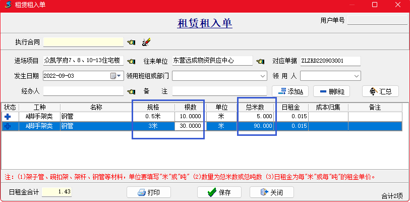 【租賃材料規格換算設置】可實現自定義指定某些租賃材料的總長度換算、總面積換算、重量換算,并可以自動去掉多余的字。