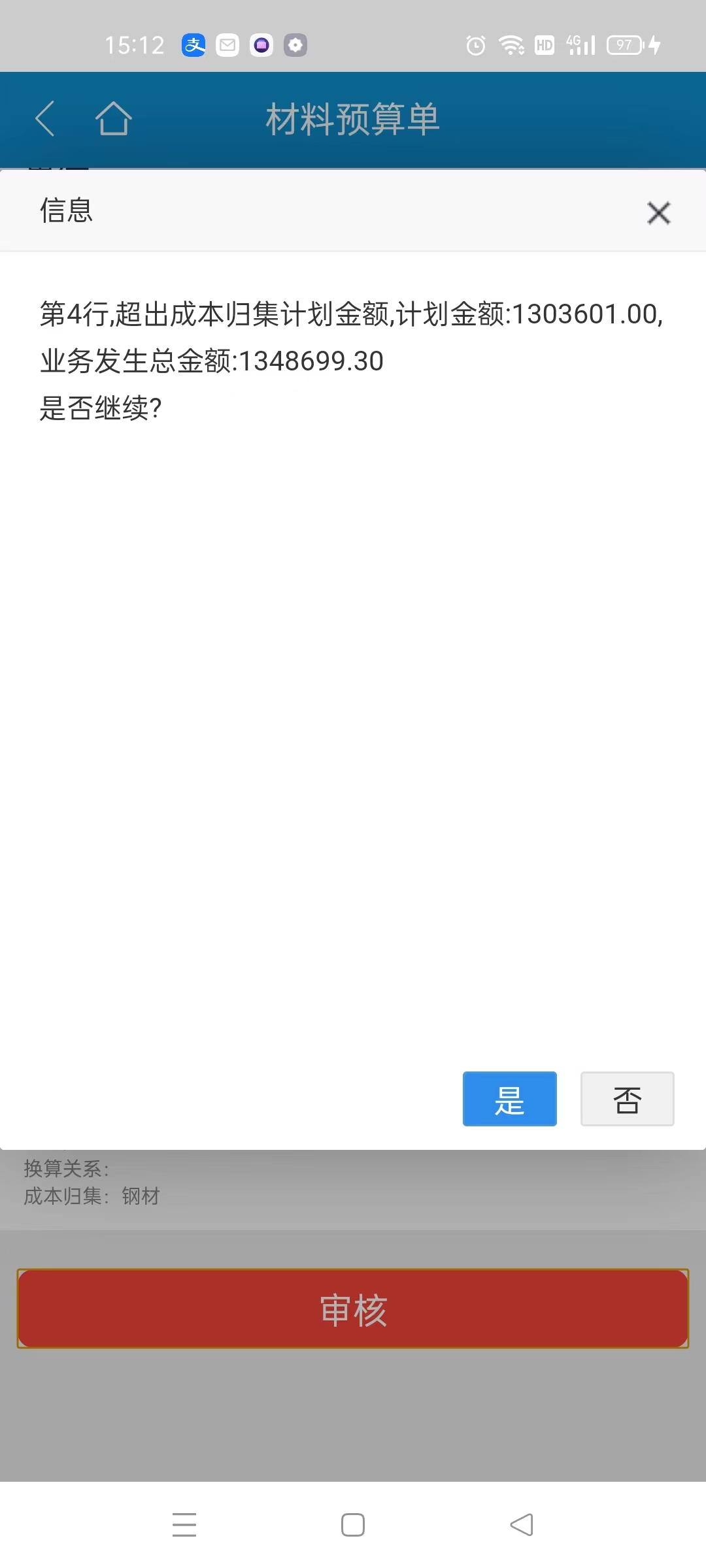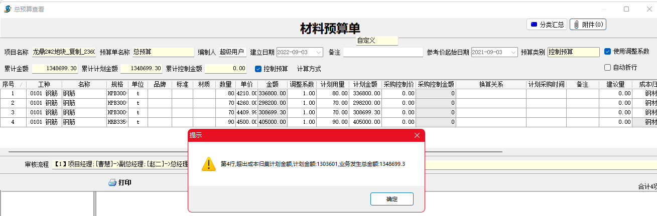 材料預算單超出成本計劃設定金額時系統會自動提示。