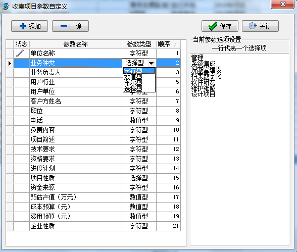 ①點“添加”按鍵增加豎列; ②在“參數名稱”列輸入需要的內容; ③“參數類型”列選擇類型,其中“字符型”可輸入文字和數值、 “選擇型”可以如下圖中顯示一行代表一個選擇項,只可選擇不能輸入 、“數值型”只能輸入數值,不能輸入文字內容 、 “布爾型”則是勾選選擇型; ④“順序”列調整自定義項的先后排序 。