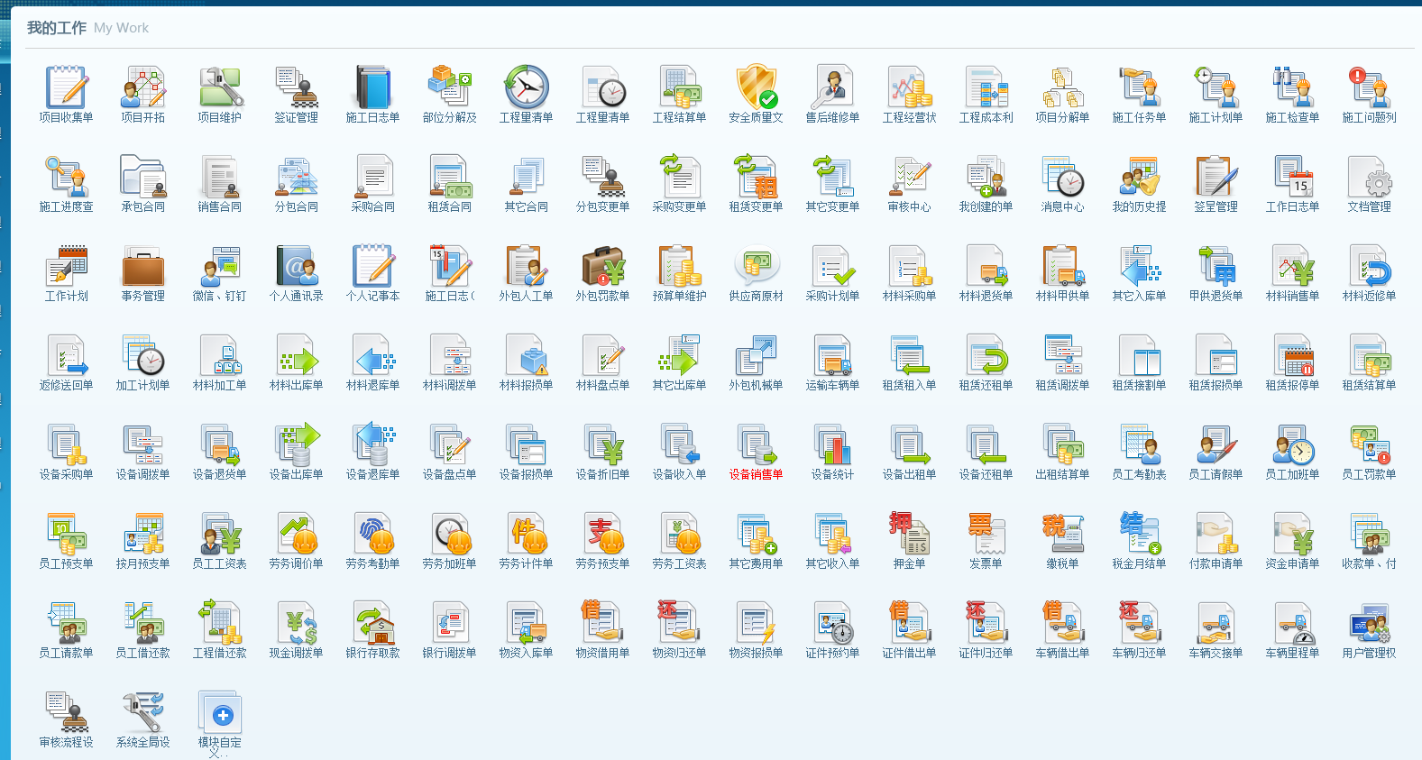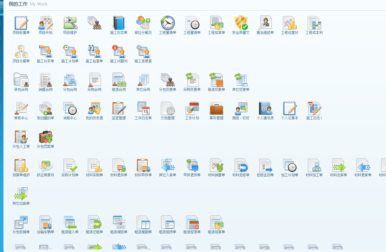1、在版本6.18中,在導航模塊中新加了【我的工作】模塊,此模塊主要用于普通用戶的常用單據和查詢按鈕的自定義設置。初始模式如下圖