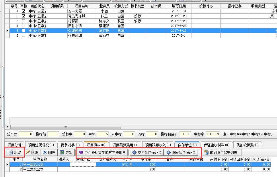 新增合作單位→中介費批量生成其他費用單據(如有中介)→支付合作保證金→收回合作保證金