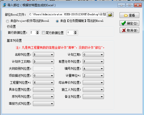 上圖為來(lái)自project軟件導(dǎo)出的excel格式。在進(jìn)度管理中導(dǎo)入時(shí)選擇好本地excel文件,設(shè)置好首行尾行數(shù)據(jù)位置,選擇好對(duì)應(yīng)excel表中各列位置,即可選擇確定導(dǎo)入,如下圖: