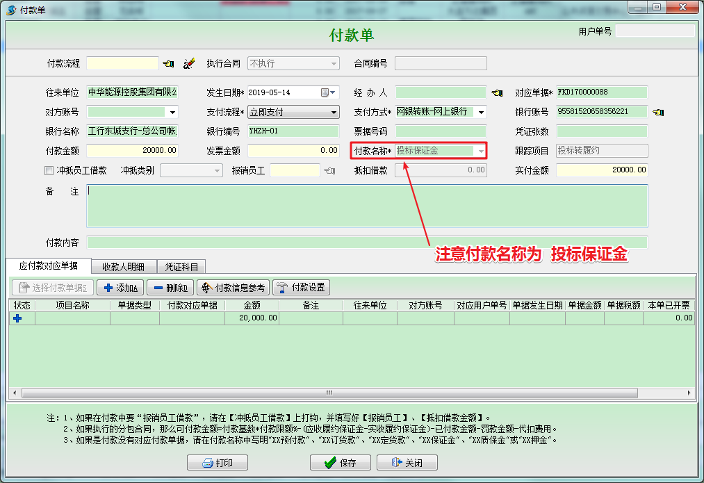 選擇結轉后,我們再去查看原投標保證金的付款單時,發現付款名稱變為:投標保證金轉履約保證金,如下圖所示,