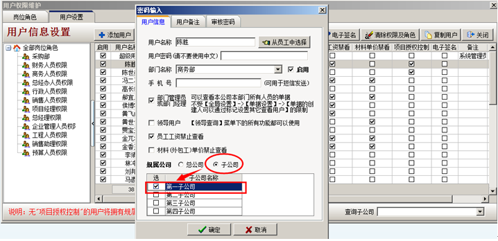 彈出密碼輸入對話框,歸屬公司選擇子公司,然后選擇所屬的子公司,點確定