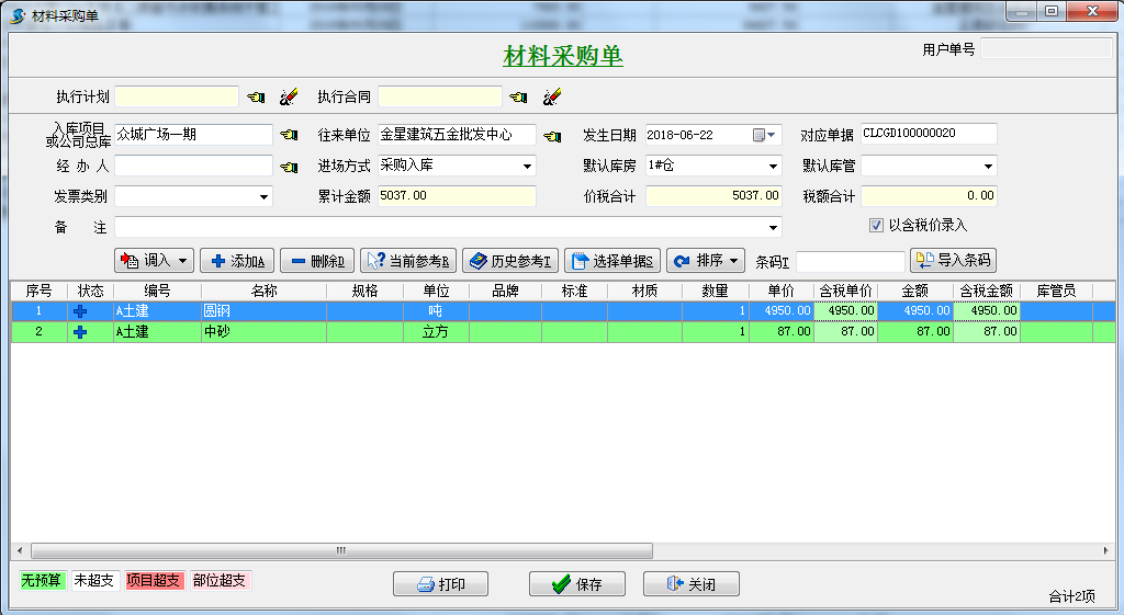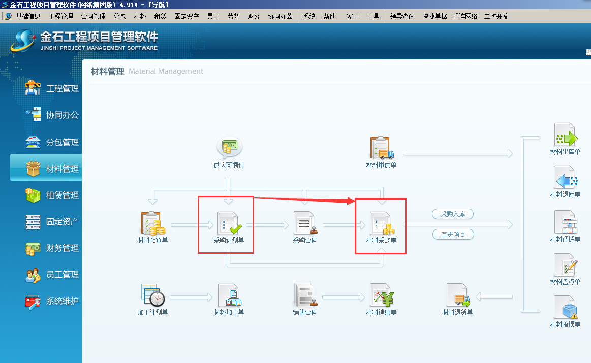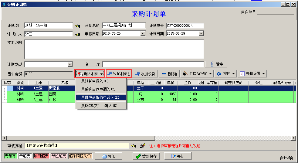 項目在工程項目管理軟件上報采購計劃,相關人員逐級審批通過,然后辦理采購,驗收入庫。(這種情況適合項目上大材批量采購,不需要簽訂供貨合同)。