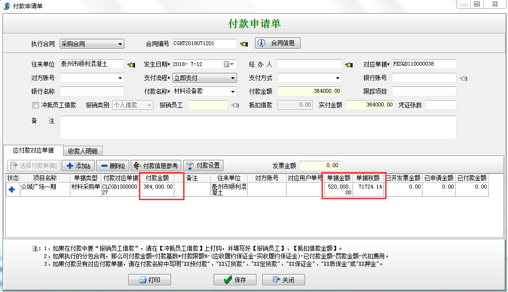 其中付款金額(364000)為合同金額(520000)*付款限額(70%)