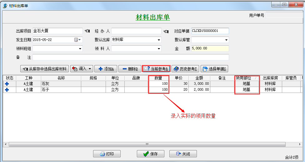 【材料出庫單】是在工地現場材料管理過程中,需要不斷從倉庫中領取材料供工地工人使用,【材料出庫單】是在工地現場材料管理中記錄了材料的領用過程。通過該單據,相關人員可以清楚地掌握各工程的材料使用狀況以及各種材料的庫存情況。錄入本單據前,需先錄入要用到【材料維護】、【項目維護】(包括【庫房信息】、【領料班組信息】)。該單據影響基礎信息中的【工程成本】、【工程材料成本對比】、【工地材料用量查詢】、【工地材料庫存查詢】、【項目材料總量、單平方用量對比表】、【材料庫存(項目用量)、采購量匯總表】以及預算里的【材料對比表】、【材料超支查詢】、【項目材料超用、節余對比表】。