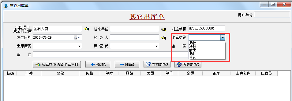 其它出庫單是指工地現場材料管理中其他方式的出庫,例如用于抵債,還料,借出,抵押等。錄入本單據前,需先錄入要用到【材料維護】、【項目維護】(包括【庫房信息】)。該單據影響【工程成本】、【工程材料成本對比】、【材料用量查詢】、【材料庫存查詢】、【項目材料總量、單平方用量對比表】、【材料庫存(項目用量)、采購量匯總表】點擊主菜單【材料】->【其他出庫單】->【新建】打開 新建【其他出庫單】窗口 界面如下: