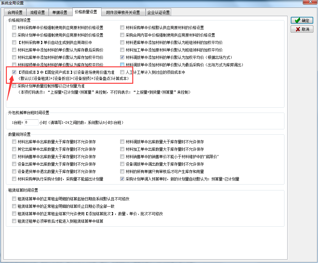 設備成本計算方法(二) 在工程項目管理軟件【系統維護】-【系統全局設置】-【價格數量設置中】有設備計算成本方式的控制開關,如下圖: