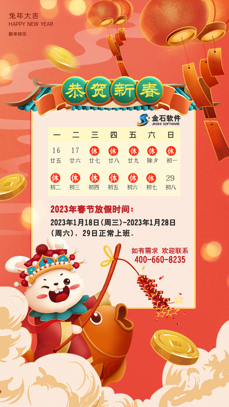金石軟件茲定于2023年1月18日開始新春假期,1月29日日恢復營業,假期雖至,如您有需求仍可以撥打400-660-8235或您所知曉的軟件工程師電話獲取服務。