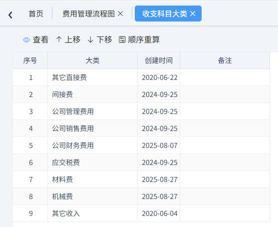 主要展示費用報銷單所用的科目,主要分為公司管理費用和項目上其它直接費用,如材料費、直接費和間接費用。如下圖
