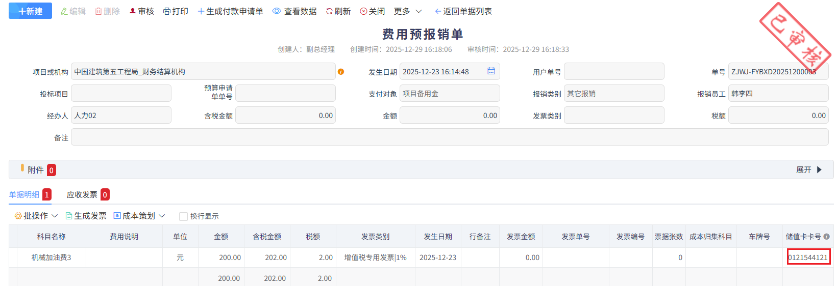 儲值卡核銷問題,需要經辦加油的人,做費用預報銷單,關聯(lián)儲值卡號,如下圖所示,