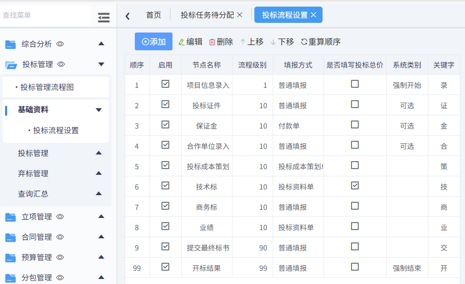 在此界面中的投標任務節(jié)點,是在投標流程設置中預先設置好的,若與公司現(xiàn)有流程有差異,可自行設置投標流程