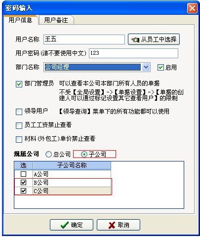 如上圖:王五規屬于B、C公司,是【公司經理】可以看到B、C兩個公司的所有部門、所有授權項目有關的業務單據。